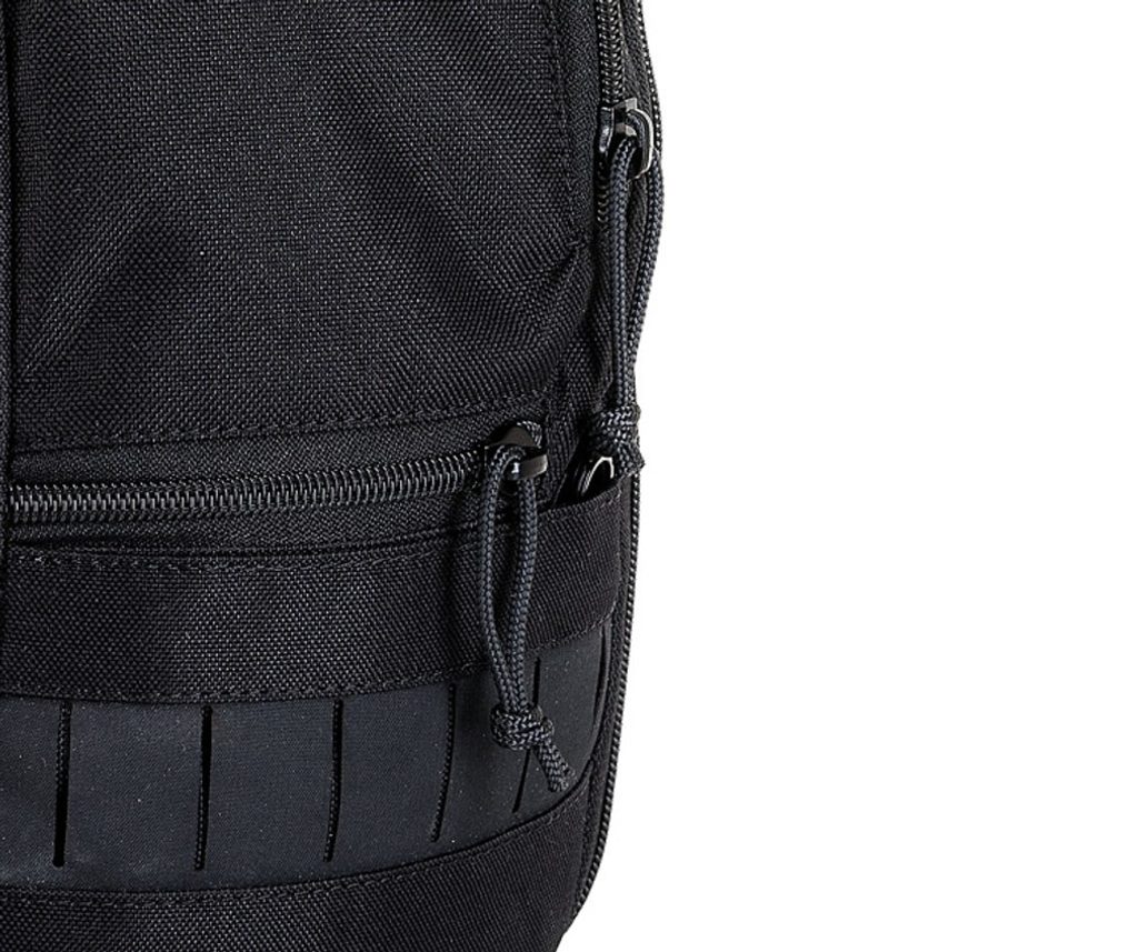 Přední strana ledvinky obsahuje další 2 menší kapsy na zip a laser Molle pás.