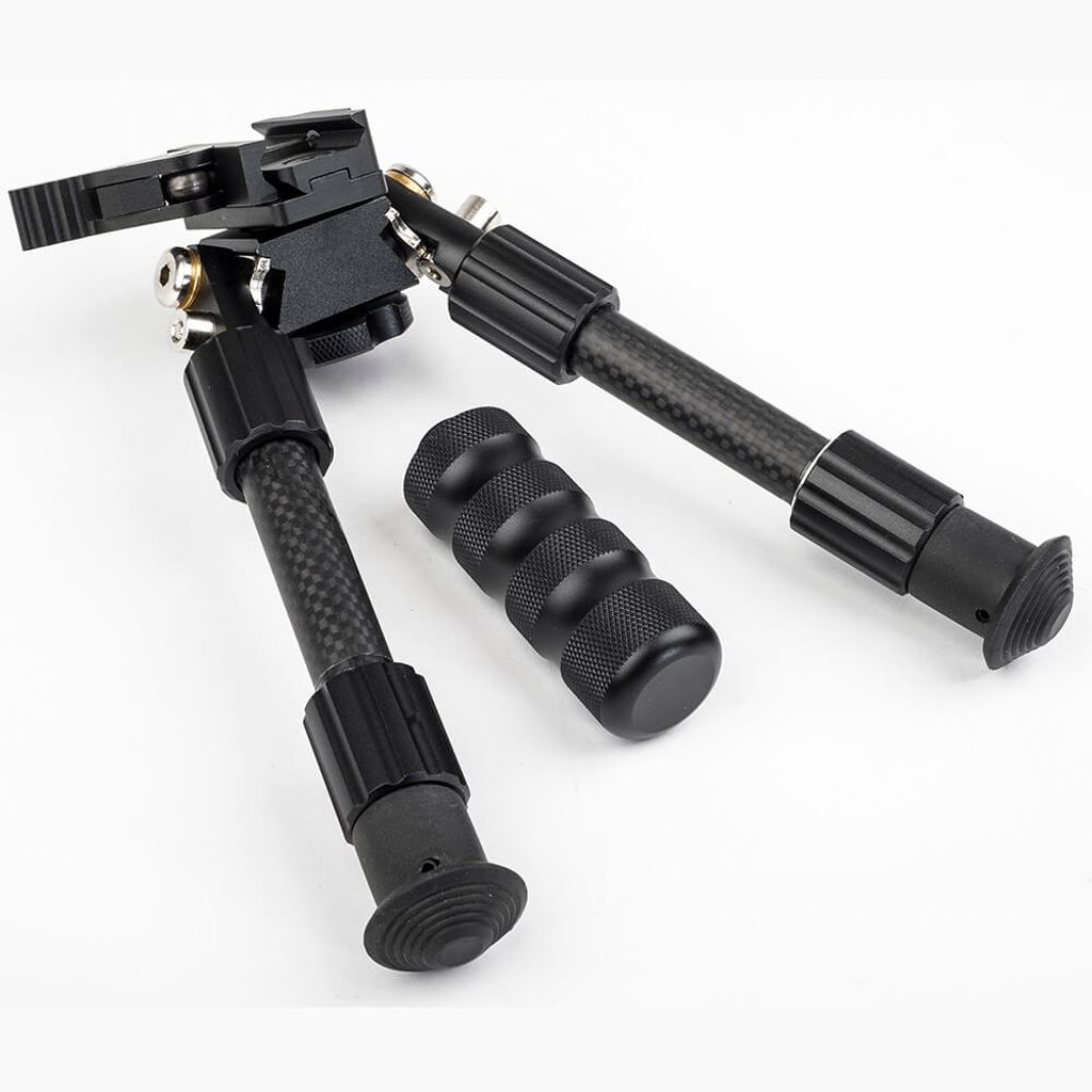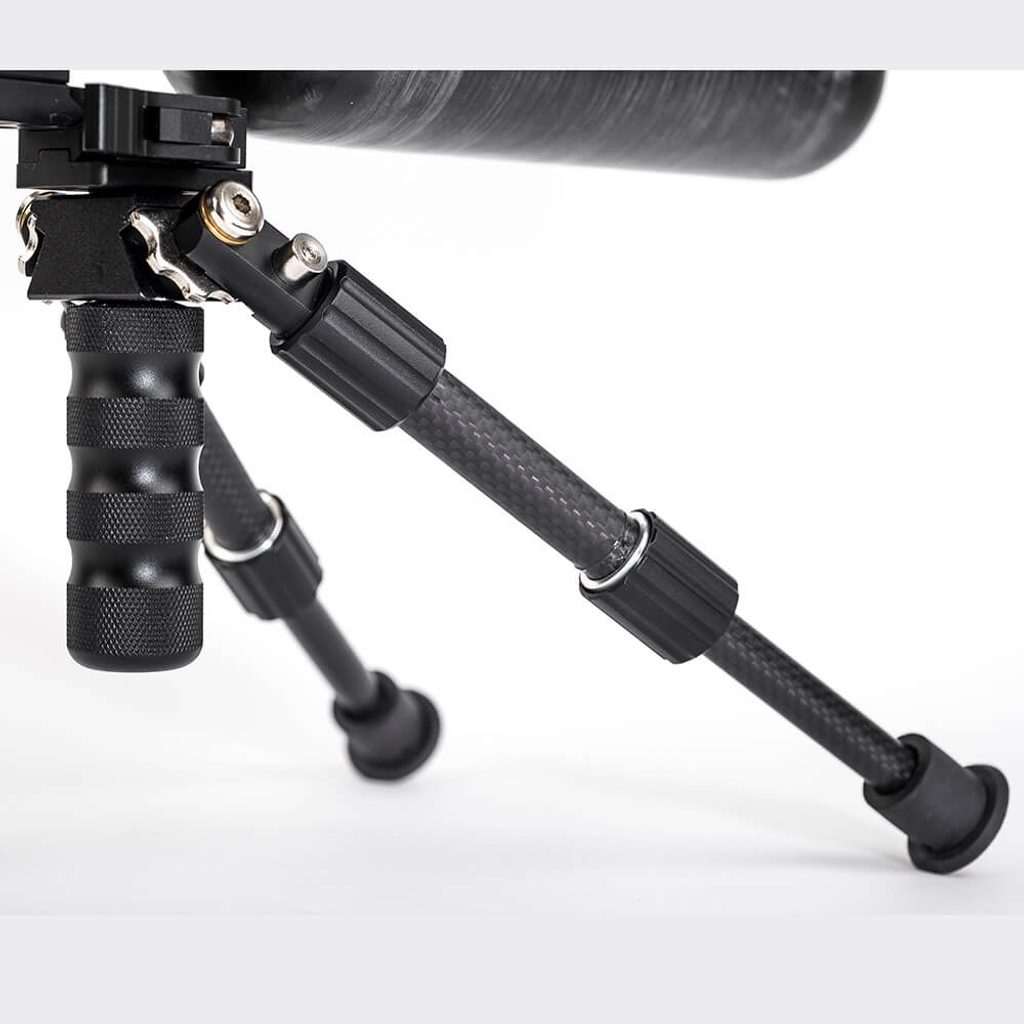 The AimGrip Bipod has legs made of carbon fibre. And each leg has a rubber foot at the base for solid support on any ground. Alloy fittings also allow for angular and height adjustments. The monopod style hand grip is made of steel and is blacked. This features a knurled and scalloped grip. The overall weight is 434g (15oz), so it will not upset the balance of your rifle.
