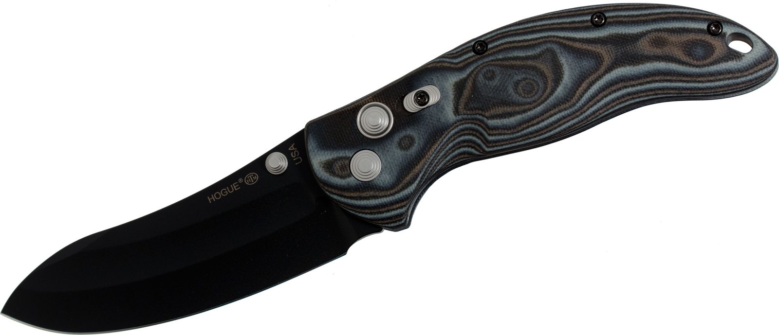 Zavírací nůž Hogue EX-04 4" Upswept G-10 Gray Lava, který navrhnul Allen Elishewitz. Čepel Upswept z kryogenicky ošetřené nerezové oceli 154CM (tvrdost 57-59 HRC) s povrchovou úpravou černý cerakote. Zámek PushButton s manuální pojistkou. Rukojeť z materiálu G-10 G-Mascus s texturou Mini Piranha. Pocket clip je vpravo, střenka obsahuje díru pro lanyard. Celková délka nože 203 mm, délka čepele 89 mm a délka rukojeti 130 mm. Vyrobeno v USA.