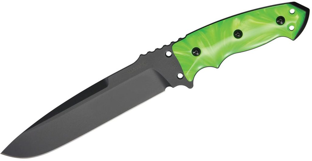 Nůž Hogue ZX-F01 Zombie 7" s pevnou čepelí o délce 17,8cm a tloušťce 6,35mm. Čepel je z kryogenicky ošetřené oceli A2. Perleťové střenky v zeleném "zombie" provedení se dvěma dírami pro lanyard. Součástí balení je MOLLE kompatibilní černý nylonový obal s Mil-spec a ochranou vložkou. Vyrobeno v USA.