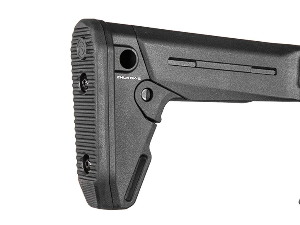 Nekompromisní skládací pažba pro moderní pušky AK, Zhukov-S Stock se skládá doprava, má nastavitelnou výšku lícnice pro použití optiky. Pažba má nastavitelnou délku botky bez použití nářadí a má šikmou gumovou patku. Pažba je také vybavena možností upnutí popruhů systému QD.
