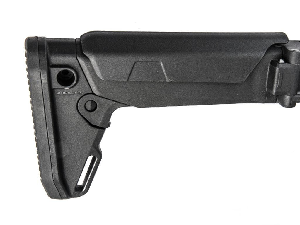 Nekompromisní skládací pažba pro moderní pušky AK, Zhukov-S Stock se skládá doprava, má nastavitelnou výšku lícnice pro použití optiky. Pažba má nastavitelnou délku botky bez použití nářadí a má šikmou gumovou patku. Pažba je také vybavena možností upnutí popruhů systému QD.
