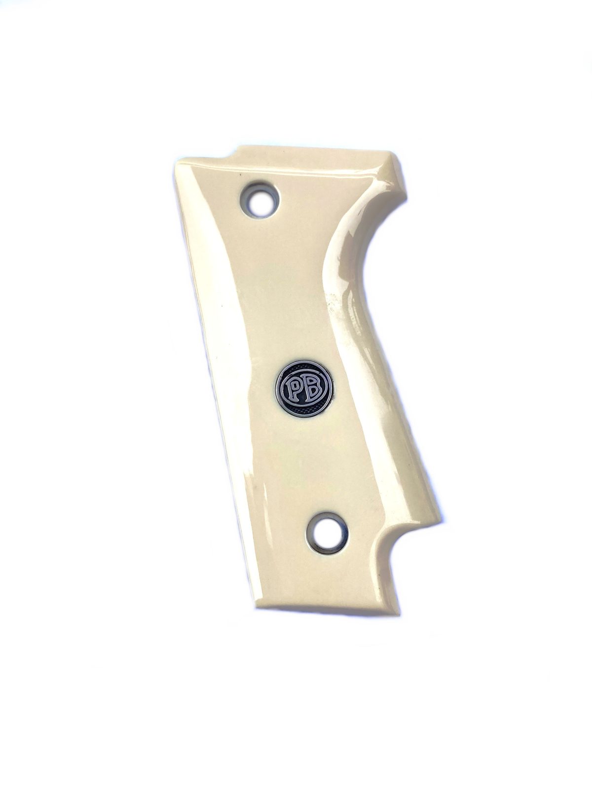 Střenky tureckého výrobce KSD pro pistole Beretta 92S, akrylát slonovina se stříbrným logem.