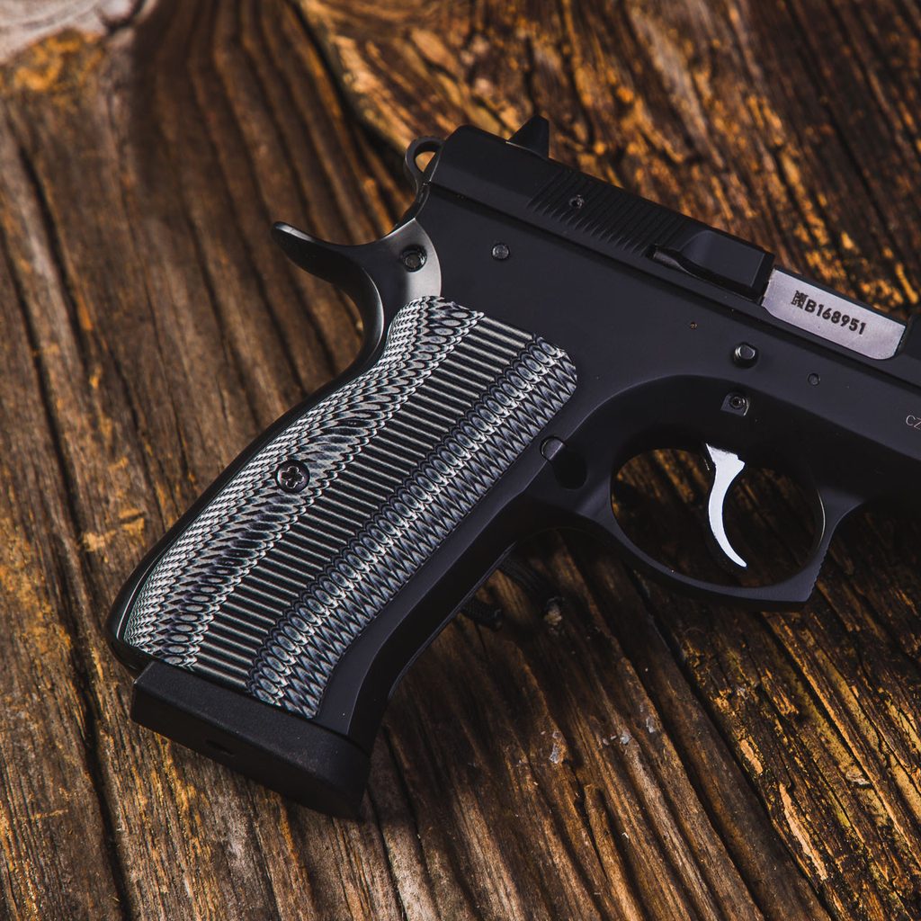 Střenky světoznámé společnosti VZ Grips pro pistole typu CZ 97. Materiál G10, barva Black Gray (černá a šedá). Zdrsnění je střední úrovně tedy citelné při úchopu, ale ne nepříjemné. Toto zdrsnění napodobující hřbet aligátora bylo původně navrženo pro Precision Weapons Section of the U.S. Marine Corps.