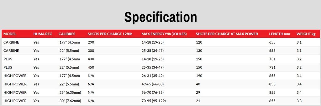 Kevlarová kartuše, taktická pažba typu AR15 zajišťují nízkou hmotnost vzduchovky a kompaktní rozměry. Díky regulátoru Huma, systému „Slingshot Hammer“, který zajišťuje přesné dávkování vzduchu a výběrové hlavni Lothar Walther je vzduchovka dokonale přesná a ve své cenové kategorii nemá konkurenci.