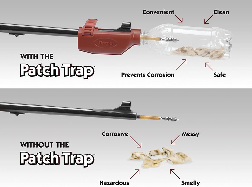 Přípravek pro čištění hlavně Tipton Patch Trap pro snadné čištění zbraně pomocí solventů. Geniálně jednoduché a užitečné řešení. Tipton Patch Trap řeší problémy kam s použitými tampony, které jsou nasáklé agresivním rozpuštědlem. Jednoduše Patch Trap před čištěním připevníte na hlaveň a našroubujete libovolnou PET lahev. Veškeré čistící tampony pak skončí bezpečně v lahvi, kterou poté jednoduše zavřete a vyhodíte.